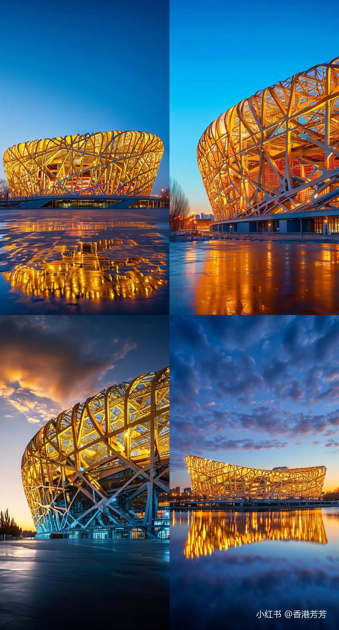 必打卡:在公园外欣赏鸟巢和水立方的建筑全貌。夜晚灯光亮起后,鸟巢的钢结构和水立方的蓝色气泡膜交相辉映,非常壮观。